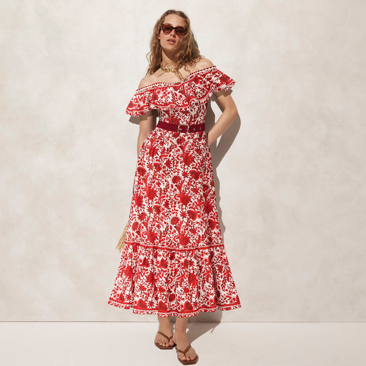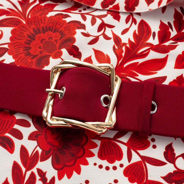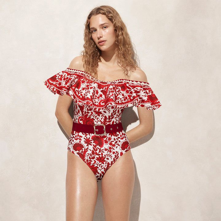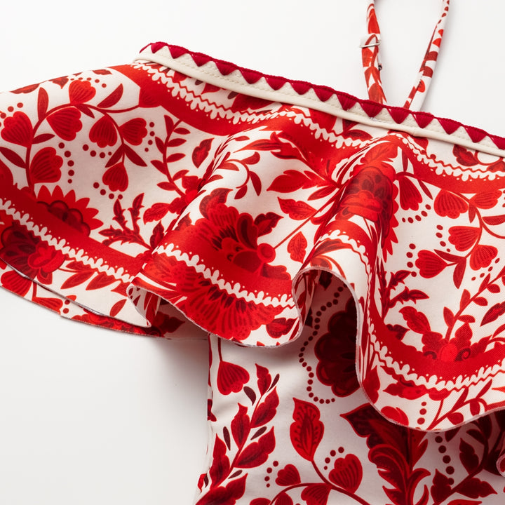 Bandeau Ruffled Red Flower Silhouette Print One Piece Swimsuit and Skirt