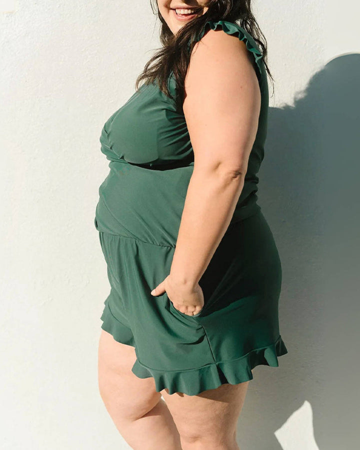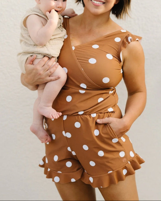 - With crossed v-neck. ruffle shoulder and hem design. nursing-friendly for moms and create a flattering look in style. ruffled sleeves and shorts come for a sophisticated take on a tropical-inspired look.