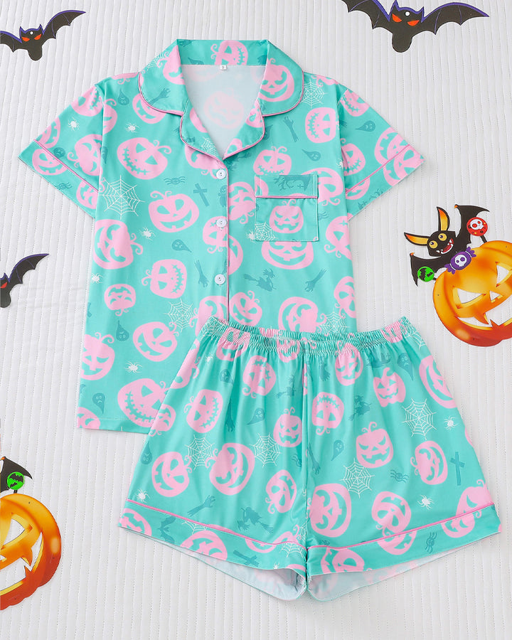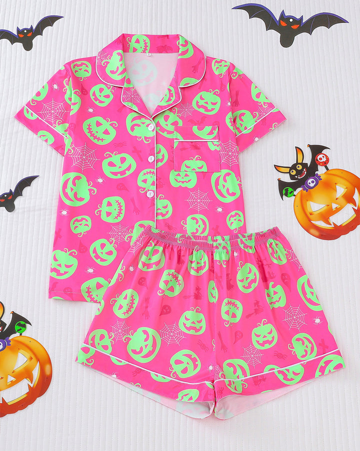 Casual Halloween Lapel Short-Sleeved Shorts Homewear Set