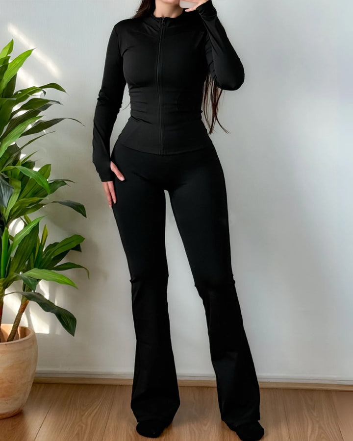 Casual Sports Tight Breathable Tummy-Lifting Buttocks Solid Color Jacket and Flared Pants Set