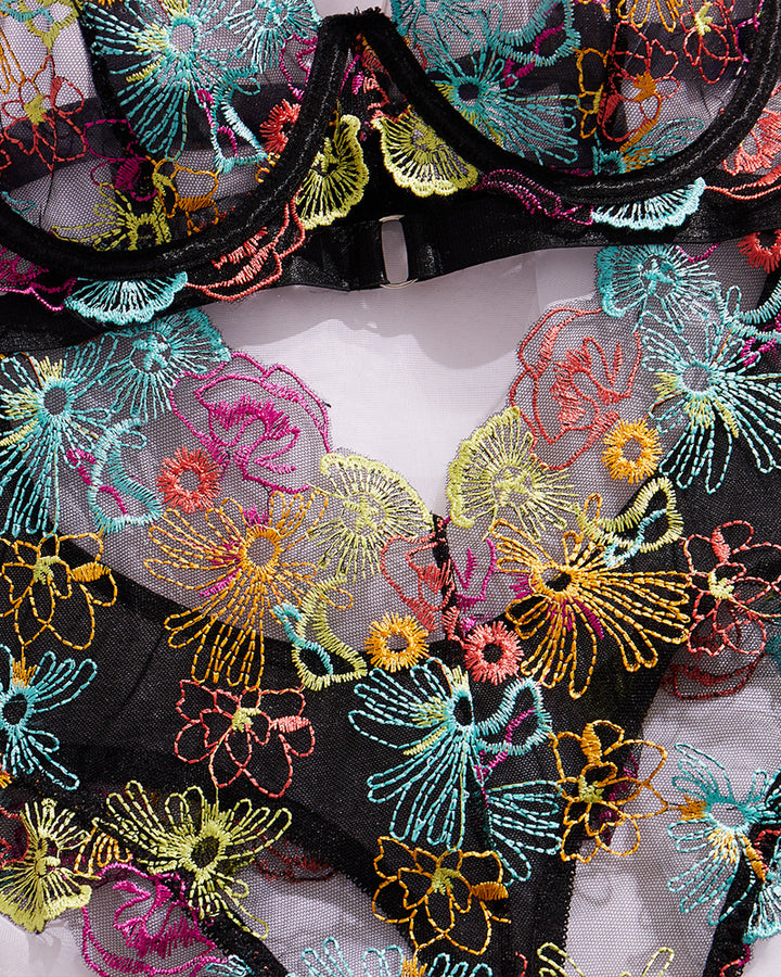 Colorful Flower Embroidery Sexy Lace Underwire Gathered Mesh Bodysuit