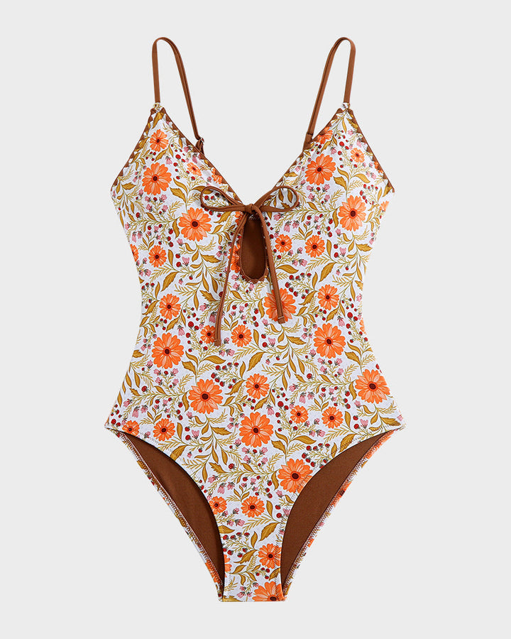 Deep V Bow Tie Floral Printed Swimsuit