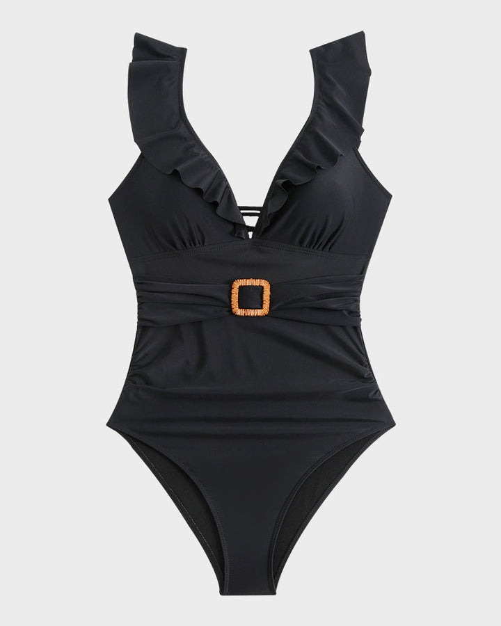 Deep V Ruffled Sleeve Belted Ruched Swimsuit