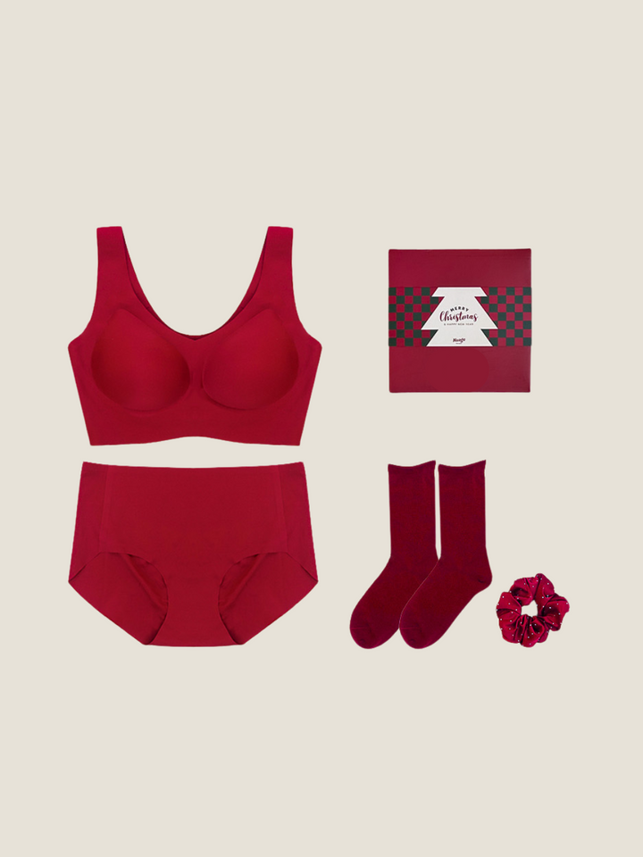 The RED Limited Edition Sweetheart Gift Set from Floralshe is a festive collection designed for the upcoming Christmas season. making it a wonderful gift for you and your loved ones. This set features the bestselling Cloudy Comfort Bra. Classic Mid-Rise Briefs. Cotton Socks. and a Scrunchie. perfect for any occasion and designed for all-day wear.