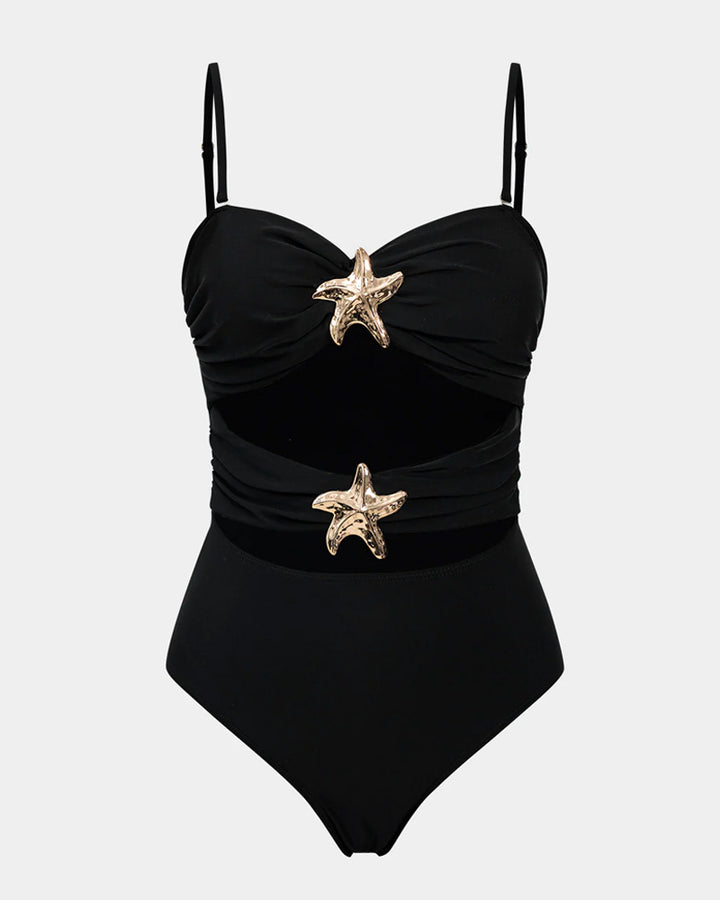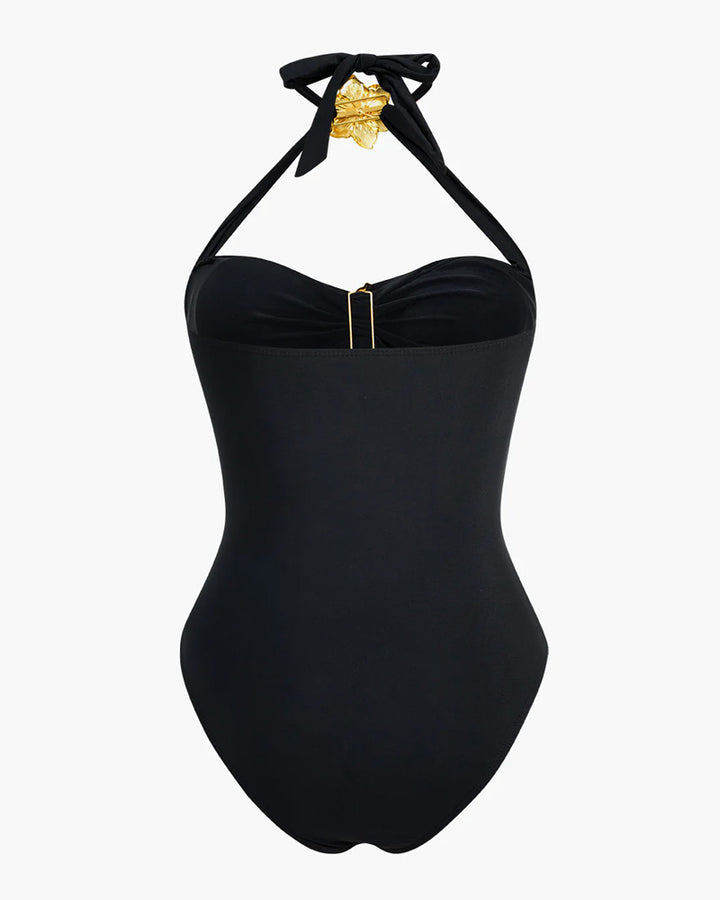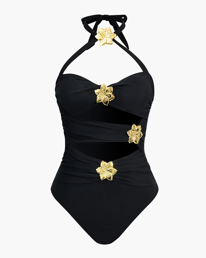 Design: The swimsuit features a chic halterneck design with subtle cut-out details that add a hint of allure while maintaining sophistication. The flower hardware accents on the straps and waistline elevate the overall look, giving it a luxurious finish.