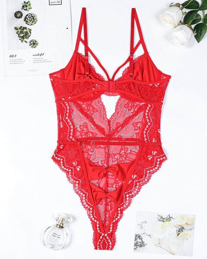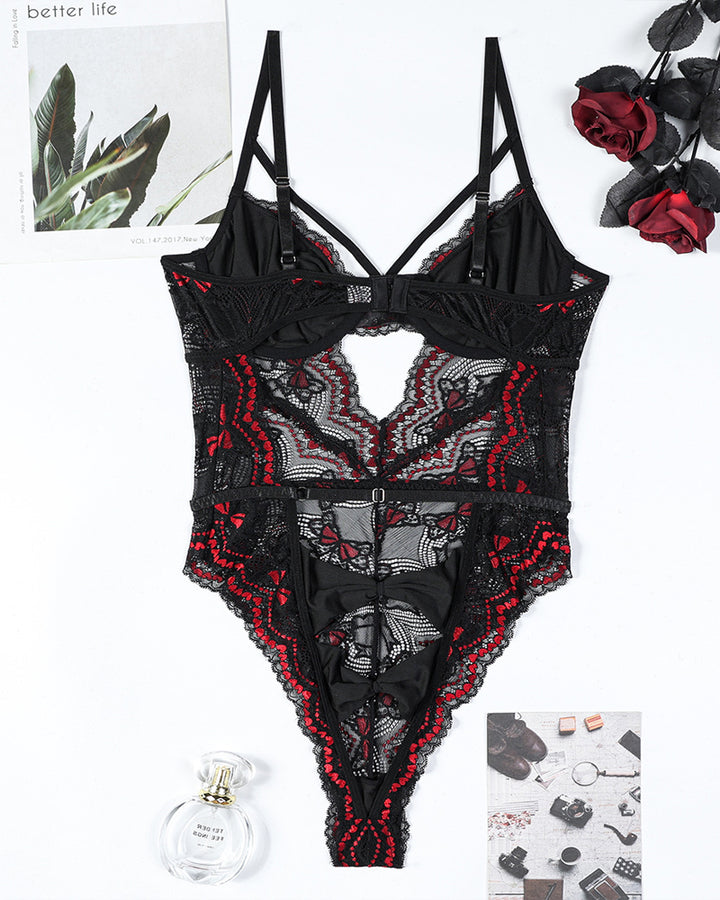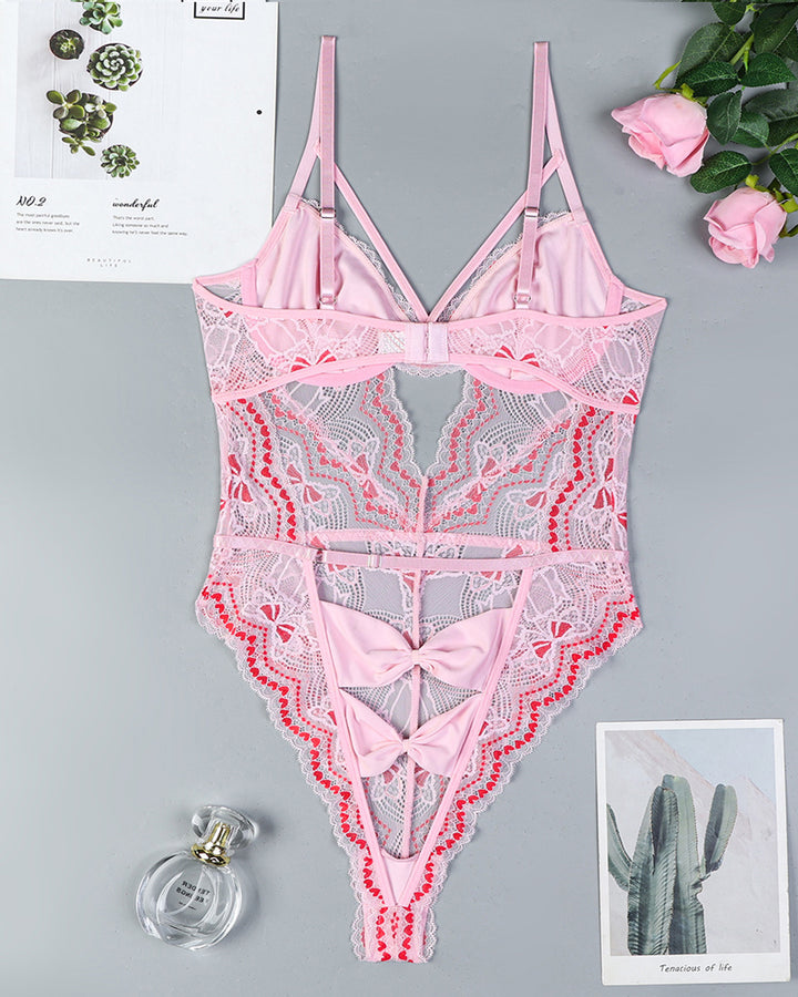 Hip Bow Hollow Sexy Lace Contrast Color Bodysuit