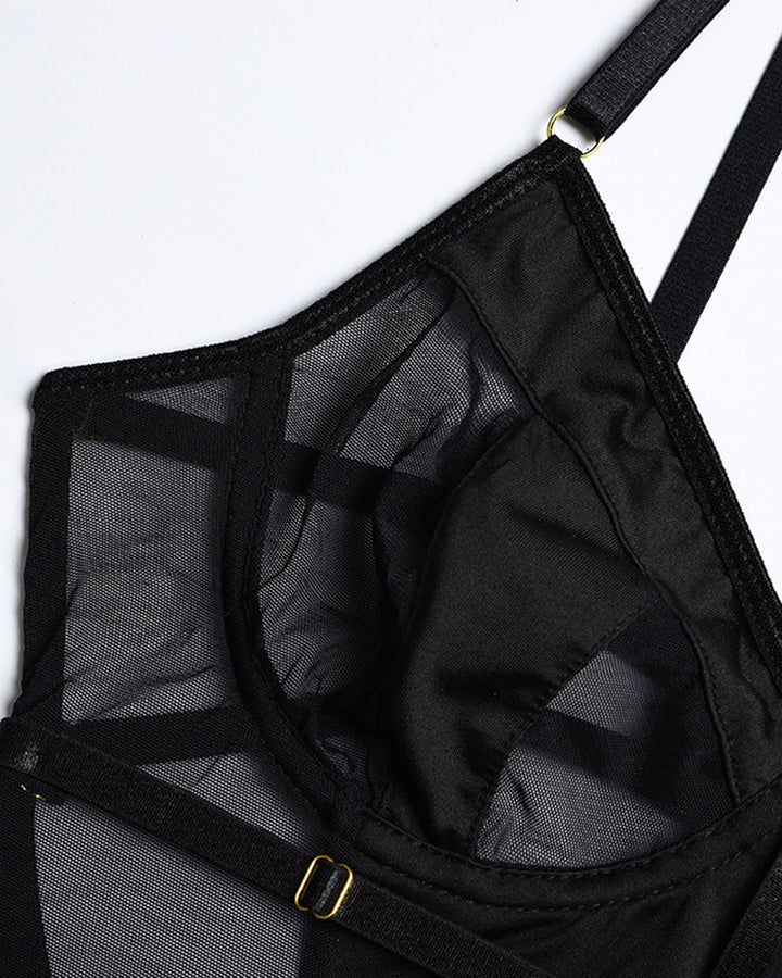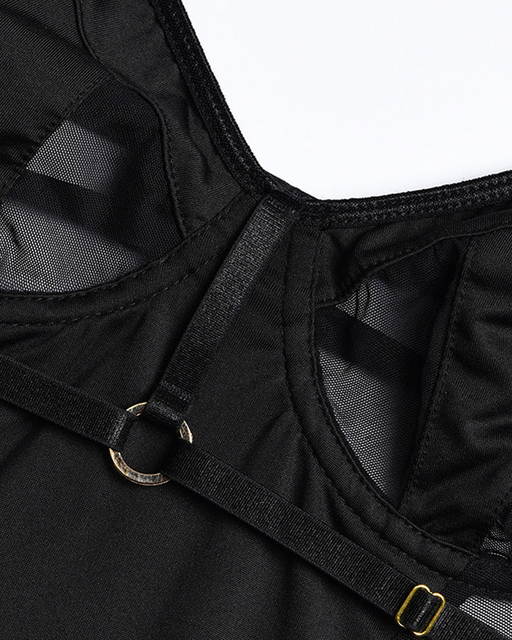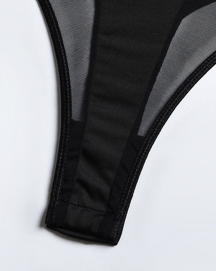 Mesh Splicing Open Back Sexy Lace-Up Suspender Bodysuit
