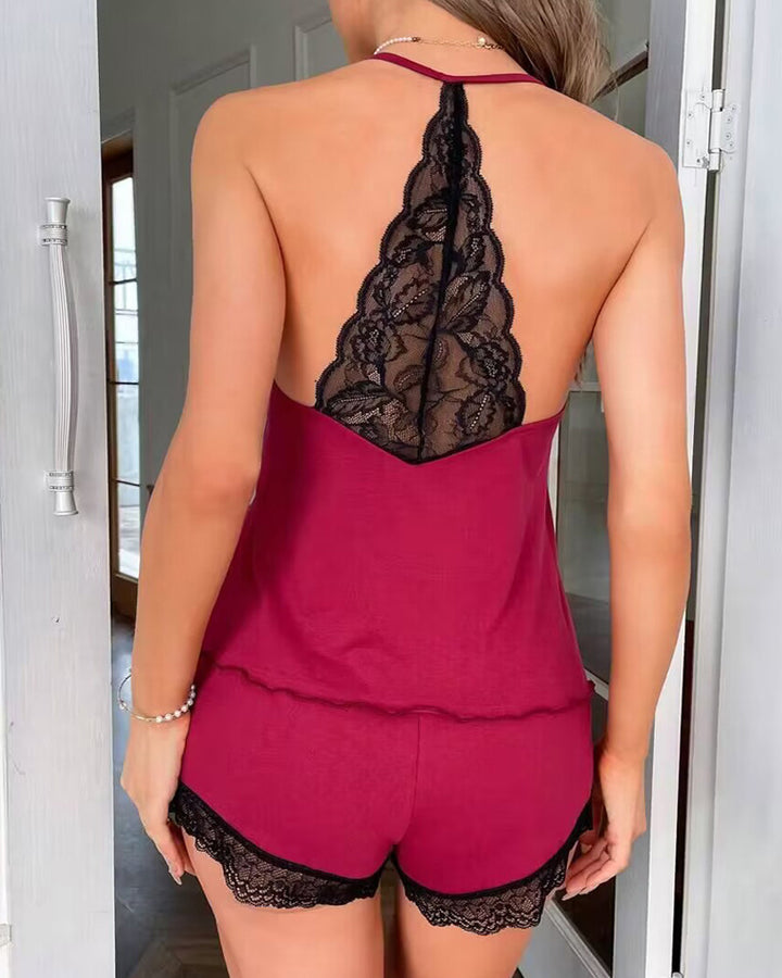 Milk Silk V-neck Suspender Lace Back Colorblock Top and Shorts Pajama Set