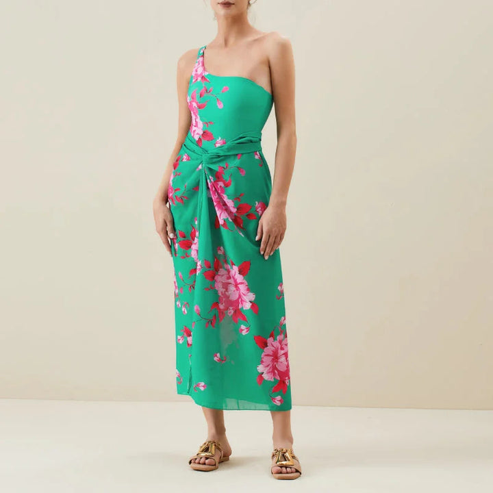 - Elevate your beach style with our One-Shoulder Printed Swimsuit. The contrasting color printing adds a touch of playfulness. while the one-shoulder design keeps you chic. Don't forget the matching sarong!