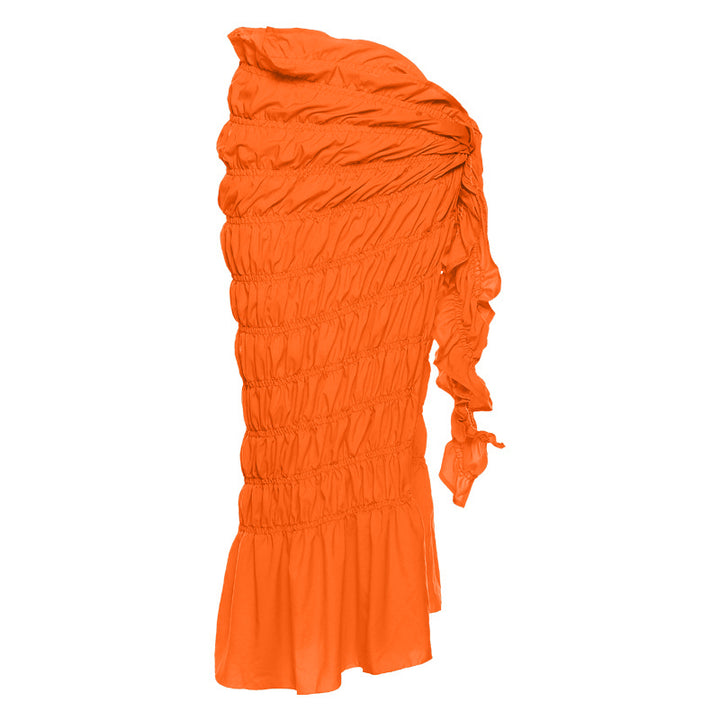 - Make a bold statement with our One-Shoulder Swimsuit in vibrant orange. The unique design and matching skirt create a chic and playful beach look.