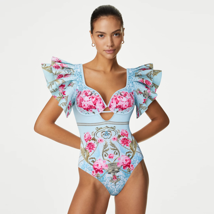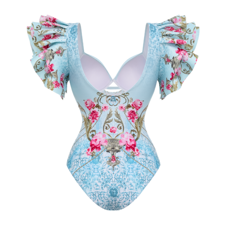 Ruffled Blue Blooming Flowers Print One Piece Swimsuit and Skirt