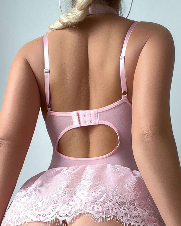 Sexy Floral Lace Low Cut Suspender Babydoll Dress with Garter Stockings