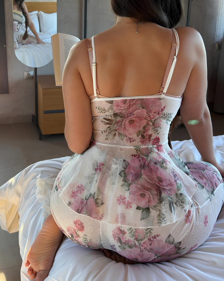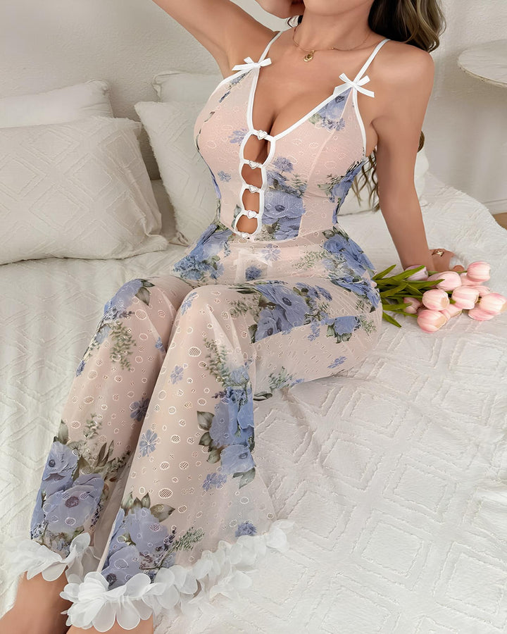 Sexy Floral Mesh See-through Ruffled Camisole and Trousers Pajama Set