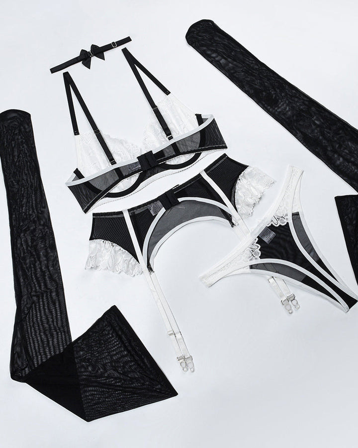 Sexy Heart Flower Lace Mesh Splicing Colorblock Fun Lingerie Set