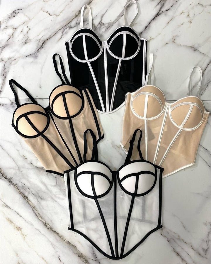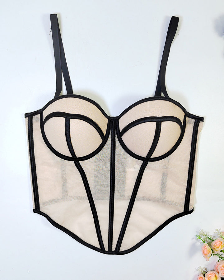 Sexy Herringbone Mesh Contrast Color Bustier Top