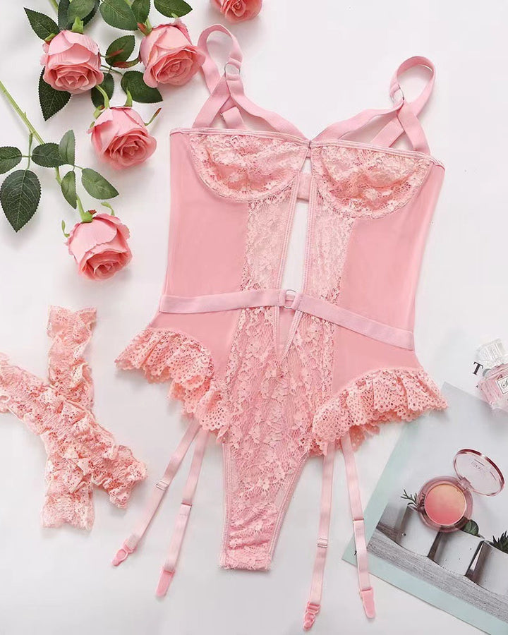 Sexy Lace Mesh Backless Ruffled Decoration Hollow Ring Buckle One-Piece Pajamas