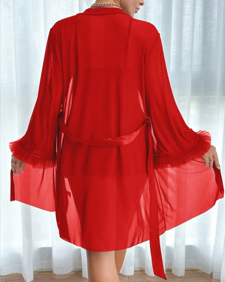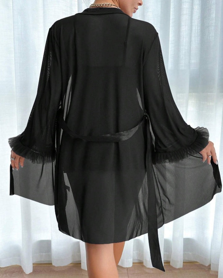 Complete the Ensemble: The knee-length robe, made from the same delicate lace and mesh, ties at the waist for adjustable coverage and dramatic flair.