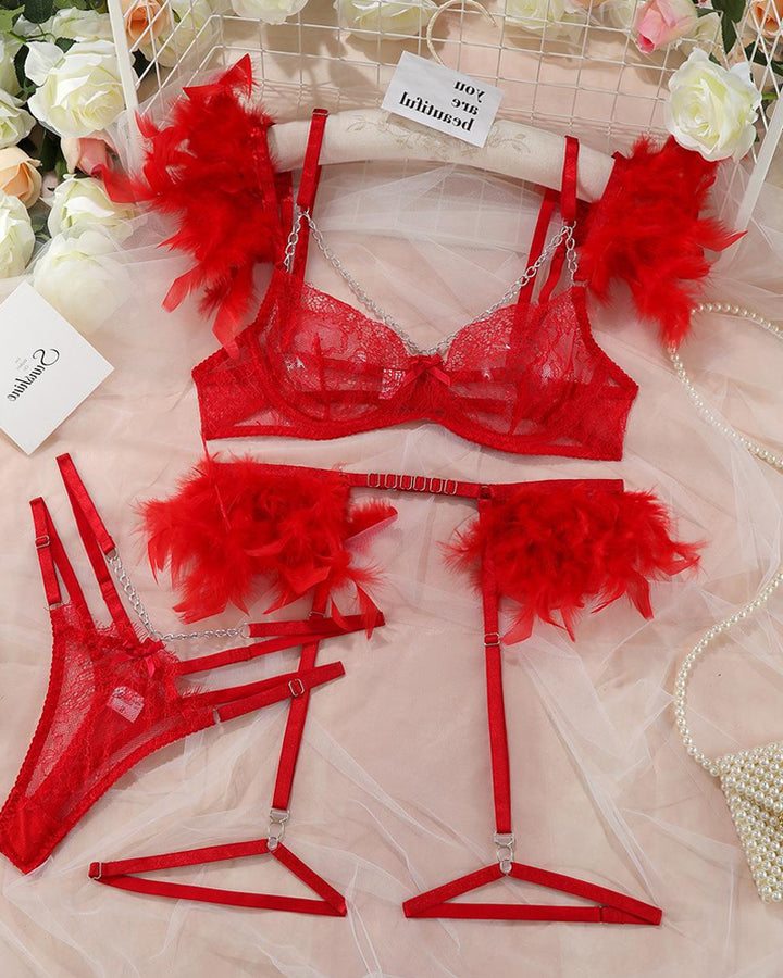Sexy Lace & Metal Chain Feather Embellished Pajama Set