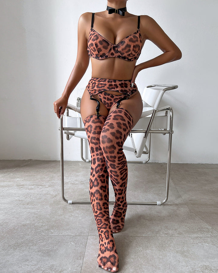 Sexy Leopard Push-Up Bra Underwear Thong Set With Stockings and Choker 6 Pieces Set