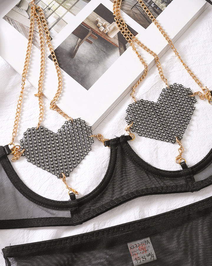 Sexy Metal Chain Suspender Heart Wire Ring Mesh See-Through Pajama Set