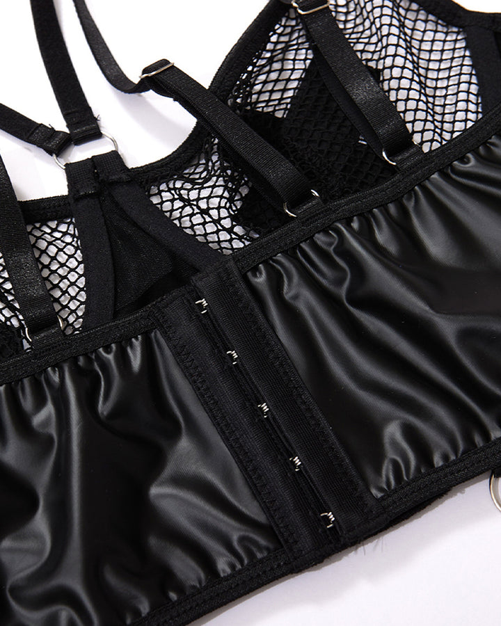 Sexy PU Leather Fishnet See-through Pajamas Set