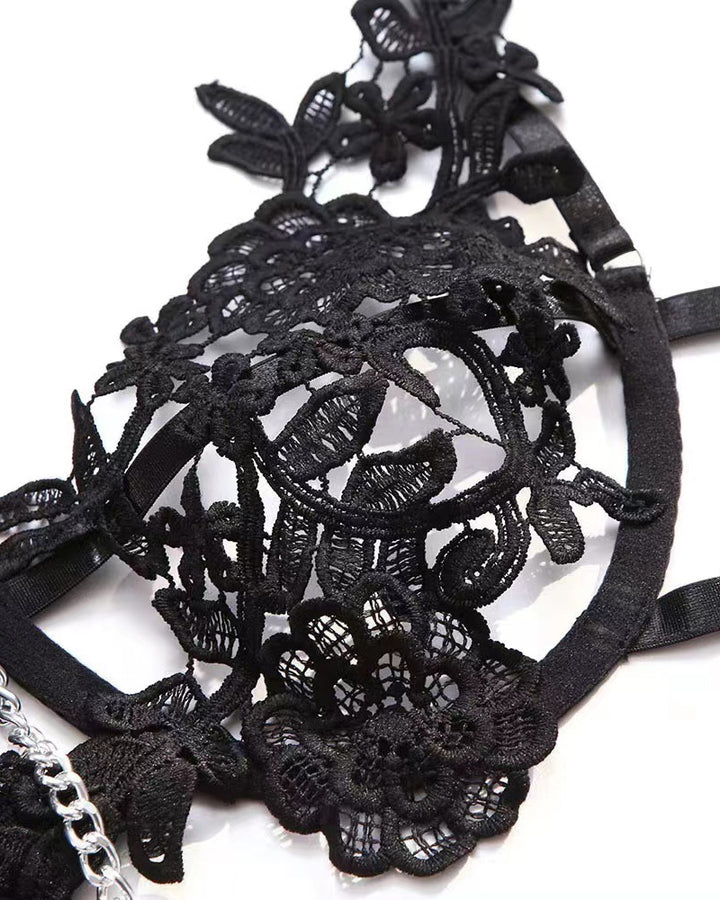 Sexy Punk-Style Metal Chain Floral Embroidered Lingerie Set