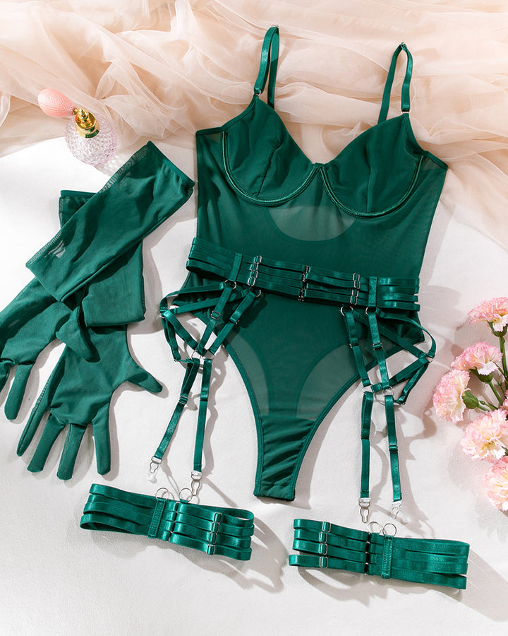 Sexy See-Through Mesh Splicing Low-Cut Bodysuit With Gloves Three-Piece Set