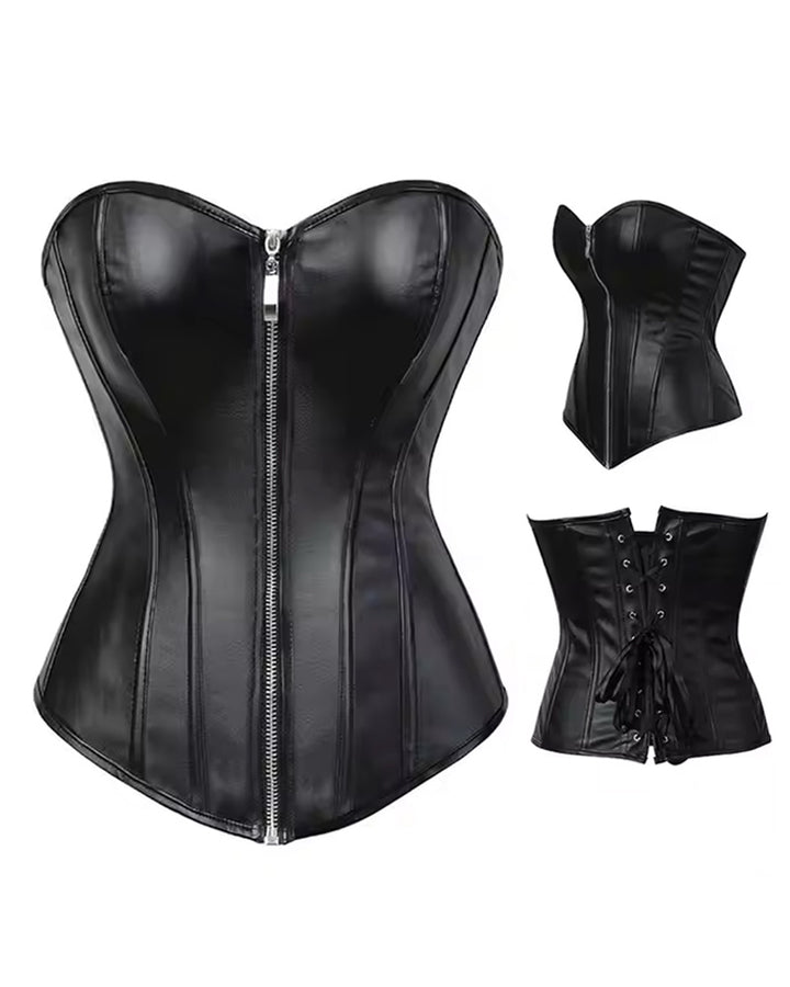 Sexy Zippered Black Leather Steel Boned Back Drawstring Corset