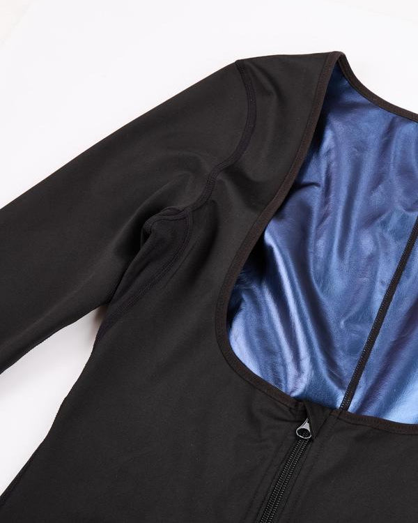 Lightweight, breathable nylon-spandex blend traps heat to promote sweating and support detoxification.