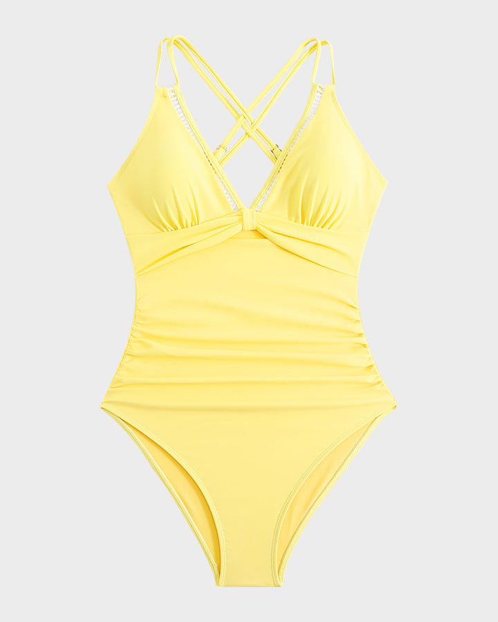 V-Neck Hollow Trim Knotted One-Piece Swimsuit