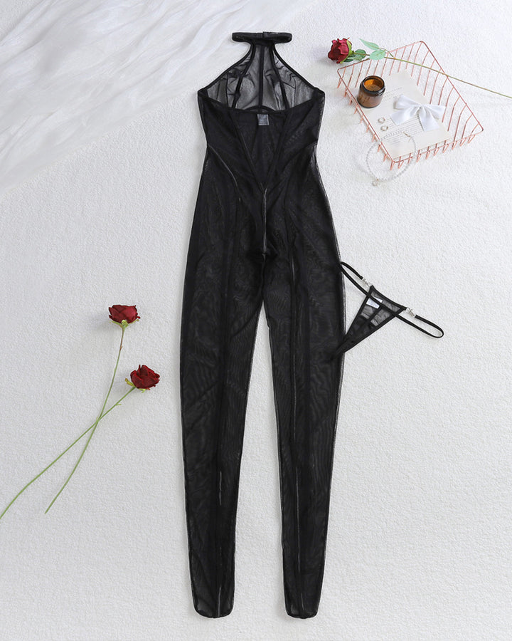 Vertical Striped See-Through Tulle Slim-Fitting Sexy Halterneck Jumpsuit