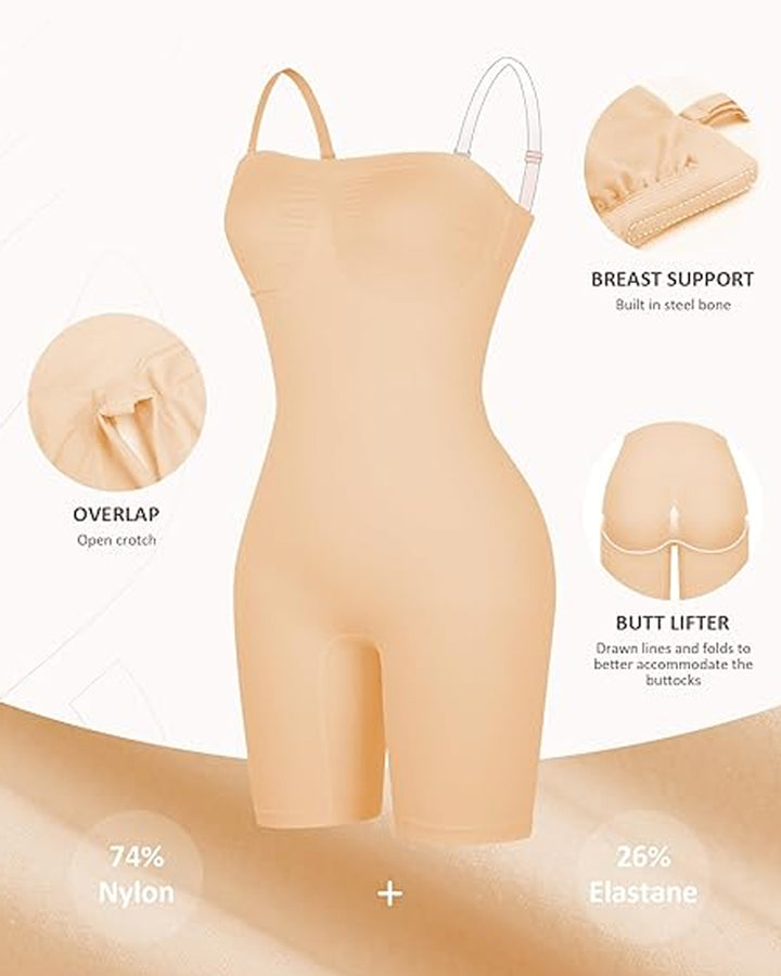 Versatile Removable Straps: Designed with a strapless neckline and matching color, this bodysuit comes with adjustable clear straps for multiple styling options—wear it strapless, classic, crisscross back, with transparent straps, or even backless for seamless versatility.