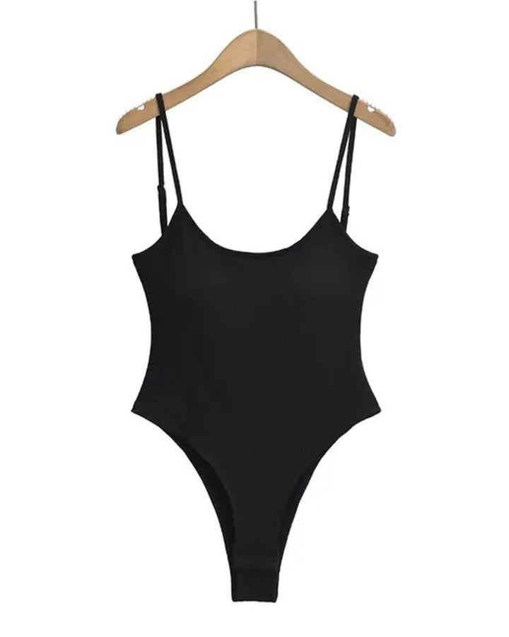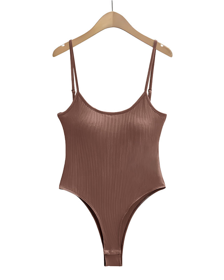 This ribbed sleeveless bodysuit features adjustable spaghetti straps, offering a stylish and functional fit that complements any outfit.